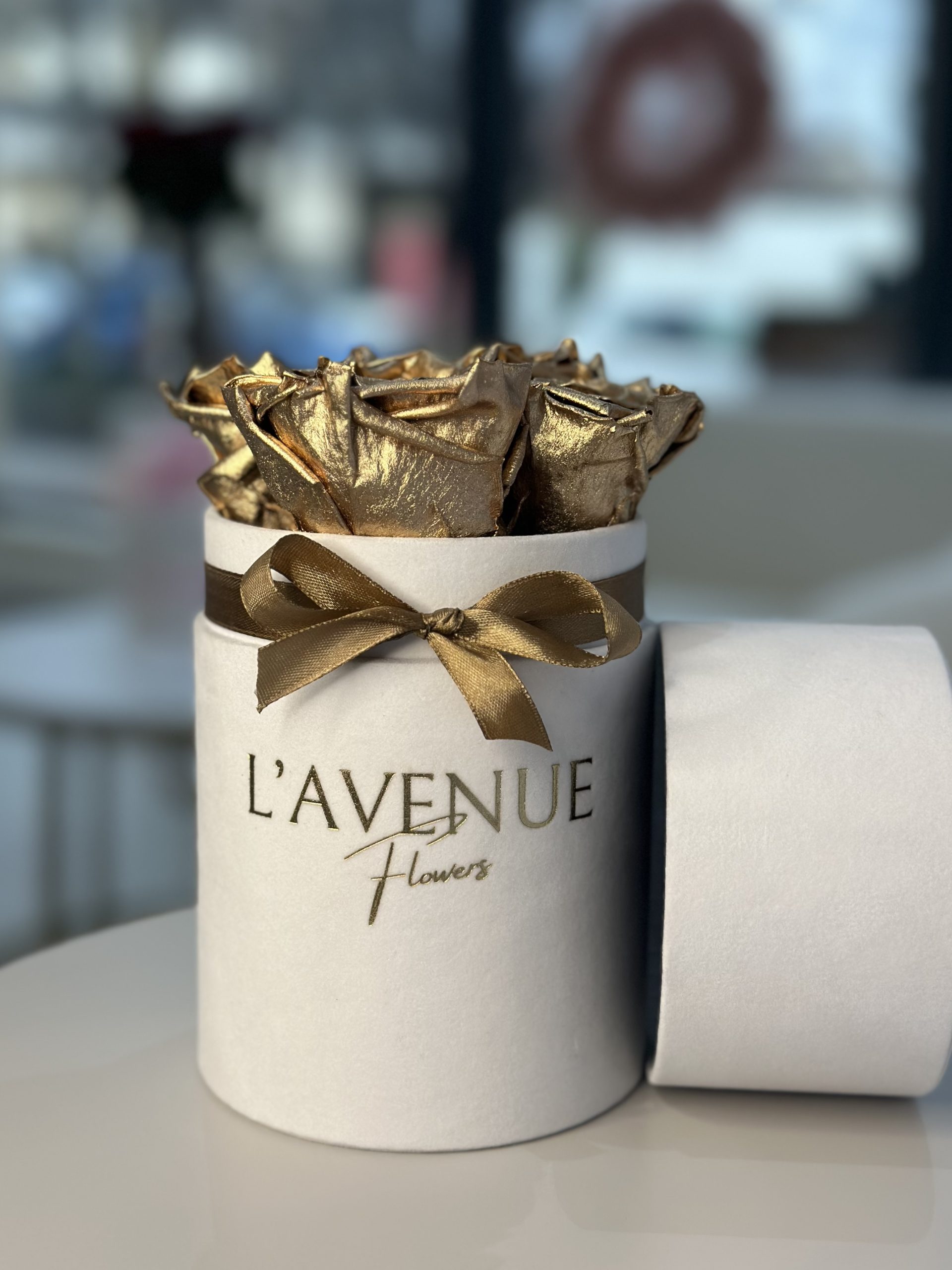 Wieczne róże w złotym kolorze! Ekskluzywny welurowy box, z pięknymi różami. Odkryj ponadczasowy urok kwiatów, który trwa przez długie lata, prezentując się równie świeżo i olśniewająco jak w dniu zakupu. Nasze Flower Boxy z wiecznymi różami to harmonia trwałego piękna i niezwykłej elegancji. Elegancki prezent w wyjątkowej formie. Żywe kwiaty, które będą świeże przez 2 lata to wieczne róże.