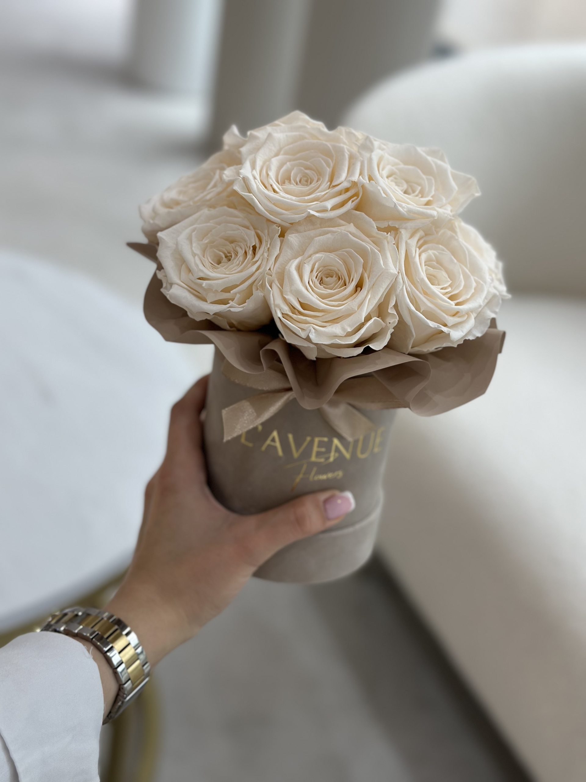 Beżowy Box z kremowymi wiecznymi różami! Wyjątkowe, subtelne połączenie, które będzie wyjątkową dekoracją! Dodatkowo są to róże, które pozostaną świeże przez 2 lata! Mały, welurowy box to ekskluzywny prezent na każdą okazję oraz niepowtarzalny wystrój wnętrz ❤️